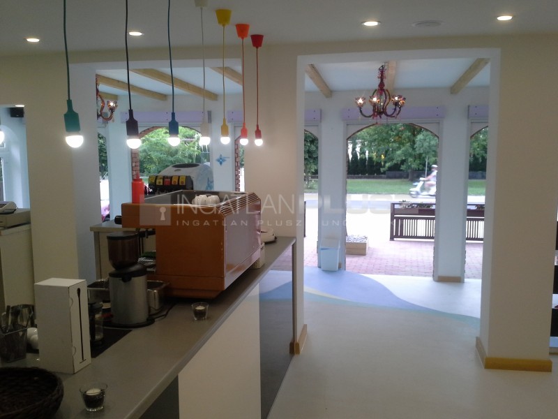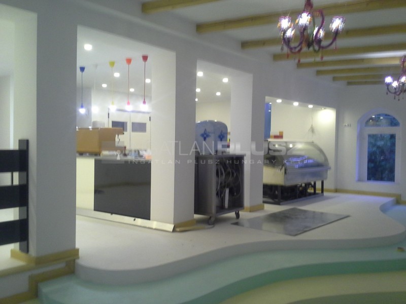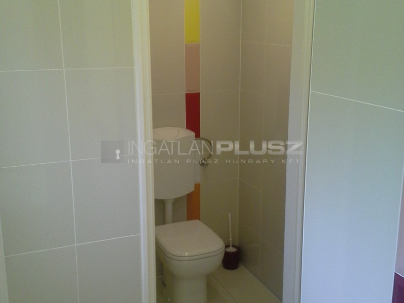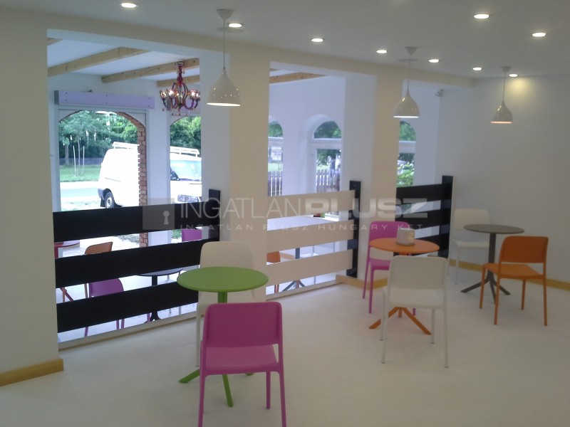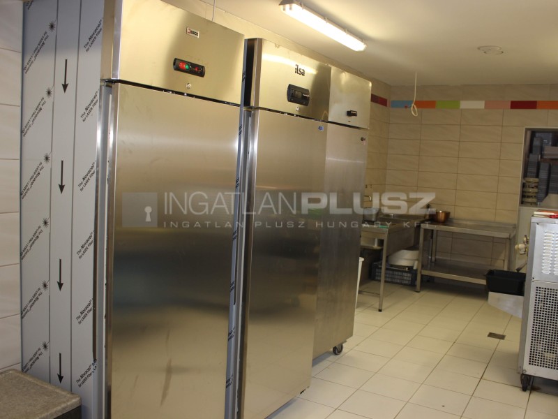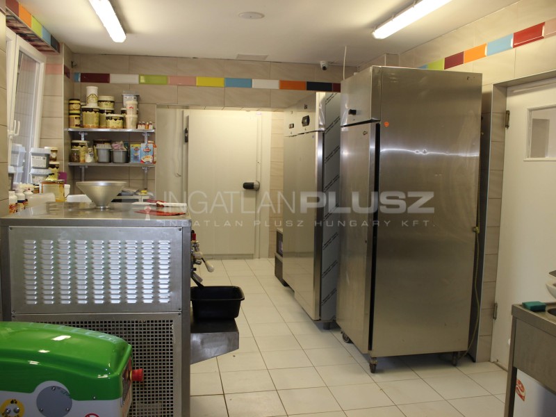 A földszinten helyet kapott egy 56 m²-es, utcafrontra nyíló fagylaltozó, teljes konyhai berendezéssel, mosdóval és külön mosdóhelyiséggel — üzleti célra azonnal használható.