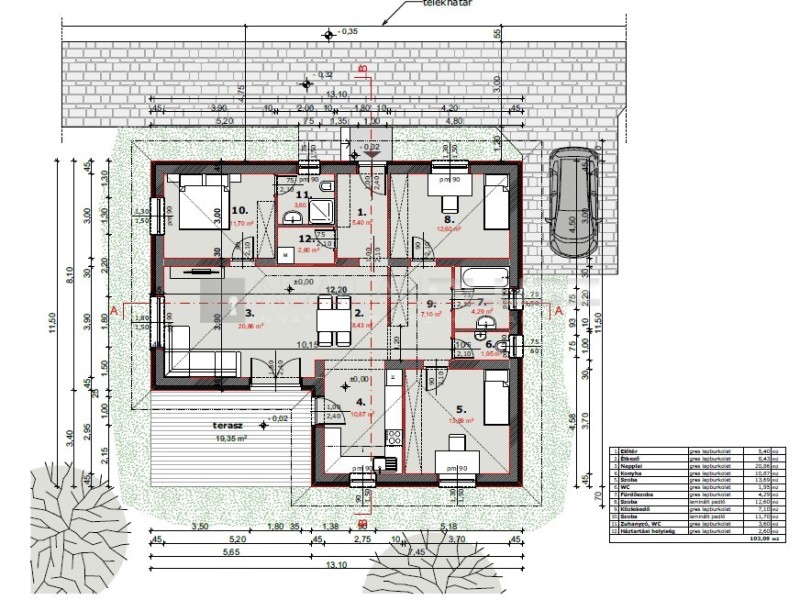 Nappali: 20,86 m² – közvetlen kijárattal a 19,35 m²-es fedett teraszra