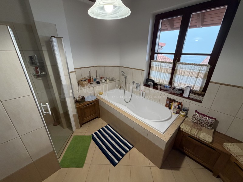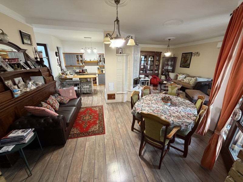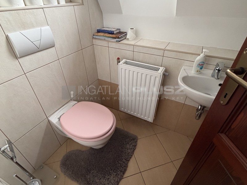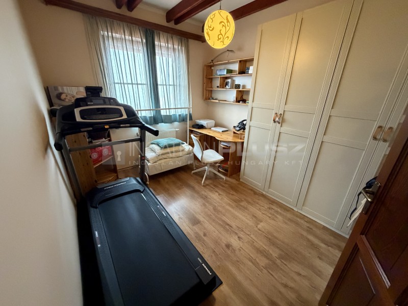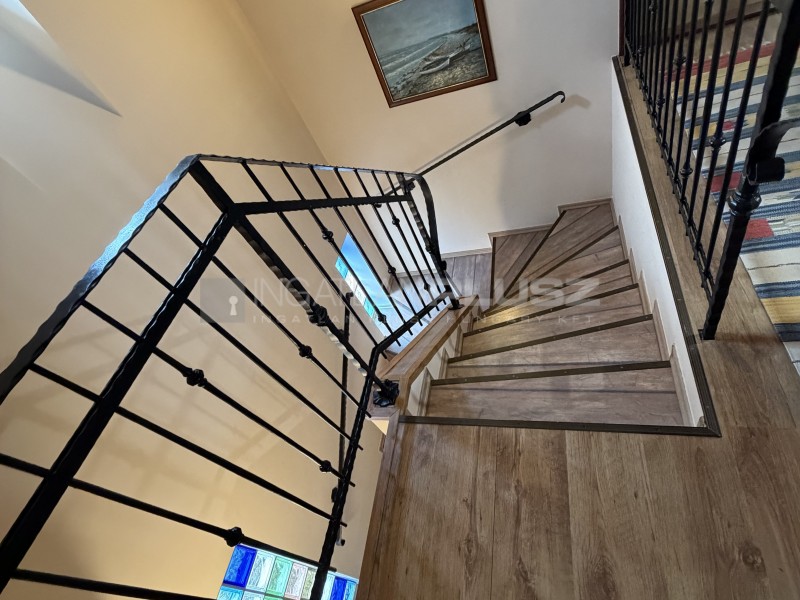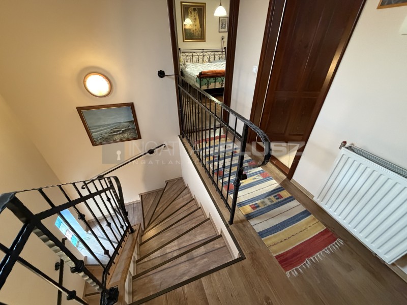 Az emeleten további 3 szoba, 2 gardrób, fürdőszoba, WC van. Fűtés turbó Cirko-Gejzír kazán által, padlófűtéssel. A szinthez kapcsolódik egy fedett, 9 m²-es panorámás erkély, ahonnan kilátás nyílik a városra.
