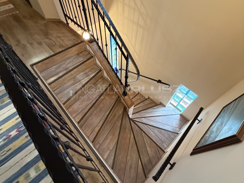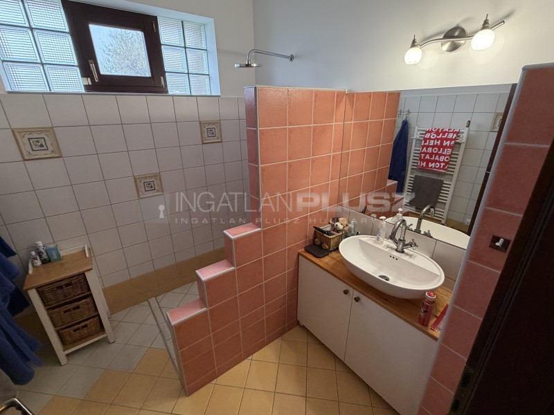 Az alsó szinten található nappali-étkezõ-konyha, kamra, szoba, fürdőszoba, WC, mosókonyha.